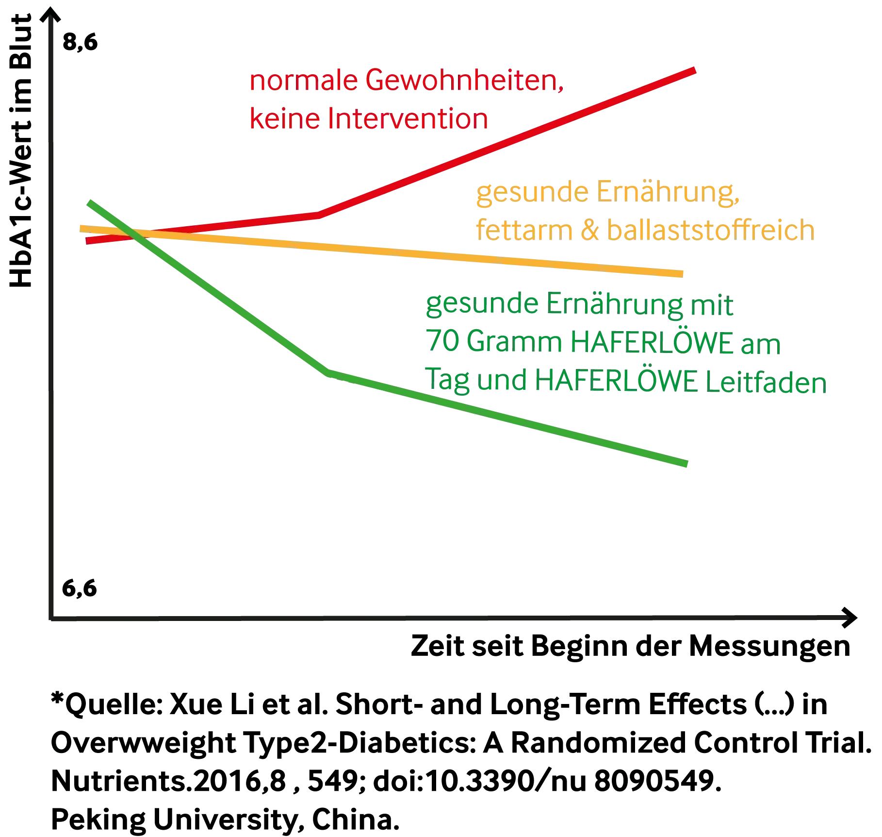 Die Forschung der Peking Universität war die Basis für die Überlegungen zu HAFERLÖWE. Mit Bezug auf die Studie haben wir die potentielle Entwicklung des HbA1c-Wert beim täglichen Verzehr von HAFERLÖWE dargestellt.