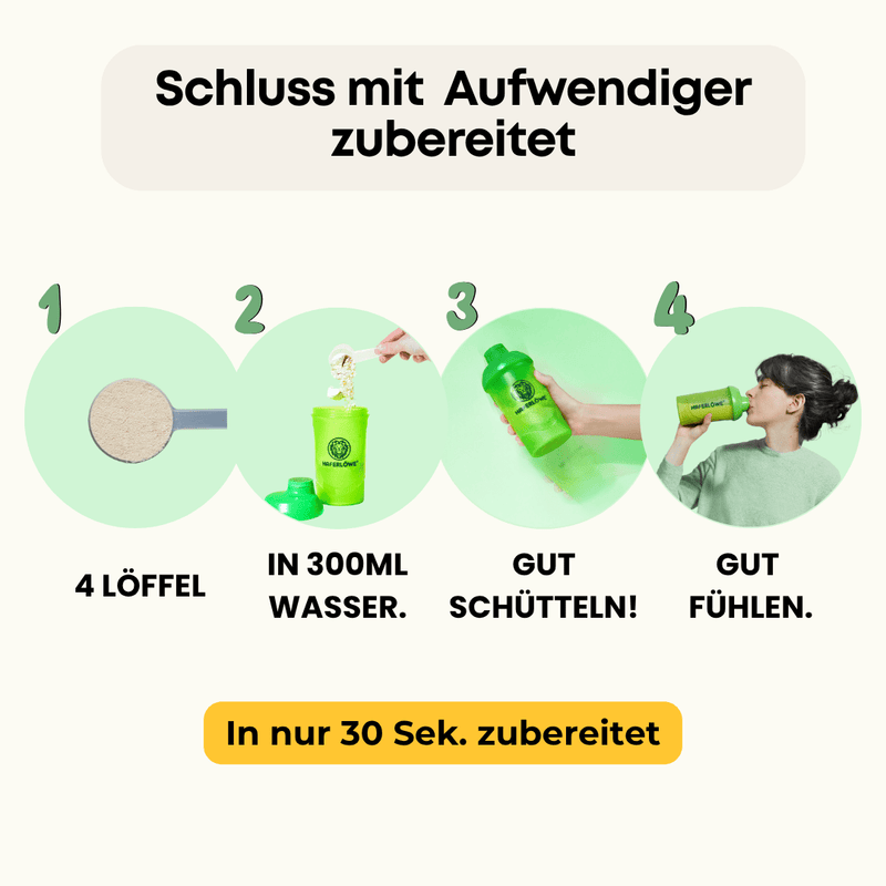 Zum ausführlichen FAQDer HAFERLÖWE-Shake ist eine leckerer Trinkmahlzeit in verschiedenen Geschmacksrichtungen. In Kombination mit Wasser entsteht eine einzigartige und gesunde Mahlzeit für Dich. Diese nimmst Du bei DIA2® oder zur Prävention zu Dir. Einmal am Tag. Jeden Tag.